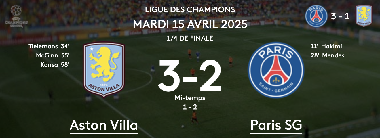 Battus 3-2 par Aston Villa en quart de finale retour, les Parisiens se qualifient pour le dernier carré de la Ligue des champions grâce à leur victoire 3-1 au... Lire la suite.